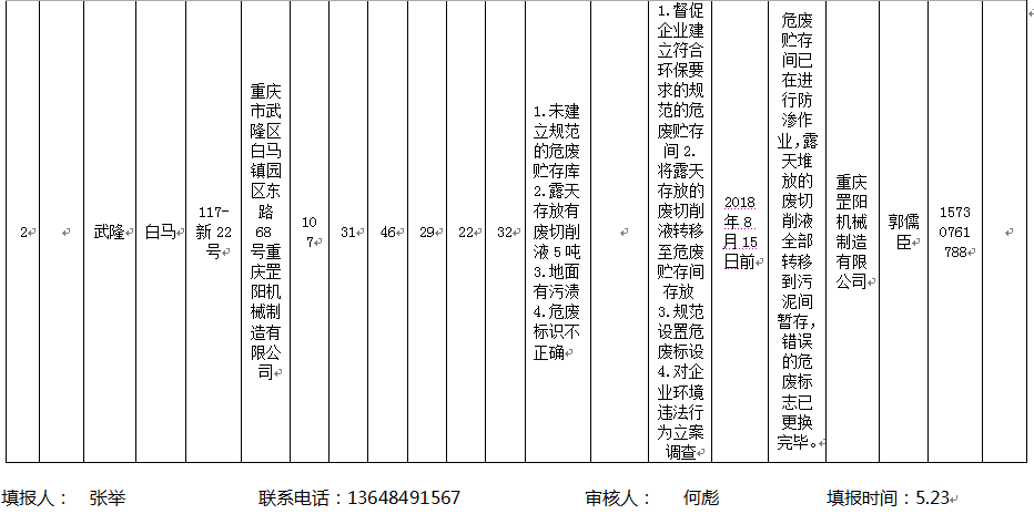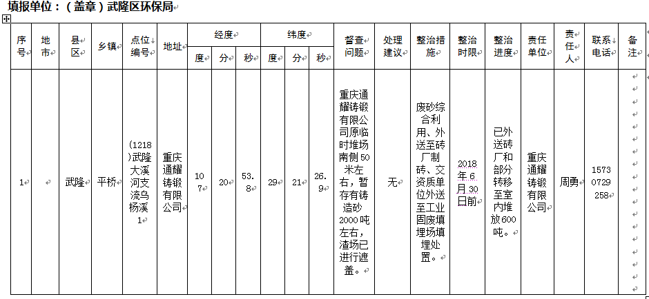 重庆市武隆区环境保护局关于生态环保部清废行动2018督查任务第117组交办问题整治落实情况表的公示
